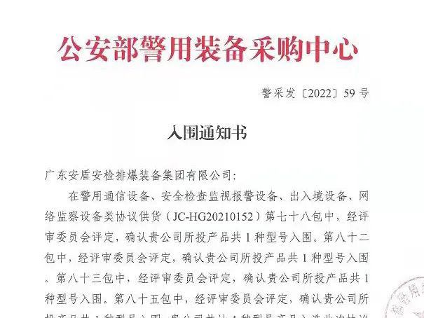 2022-02-28近日,在公安部警用裝備采購(gòu)中心警用通信設(shè)備、安全檢查監(jiān)視報(bào)警設(shè)備、出入境設(shè)備、網(wǎng)絡(luò)監(jiān)察設(shè)備類協(xié)議供貨公開(kāi)遴選項(xiàng)目中,廣東安盾安檢排爆裝備集團(tuán)有限公司研發(fā)的X射線安全檢查設(shè)備、安檢門(mén)